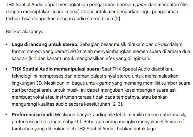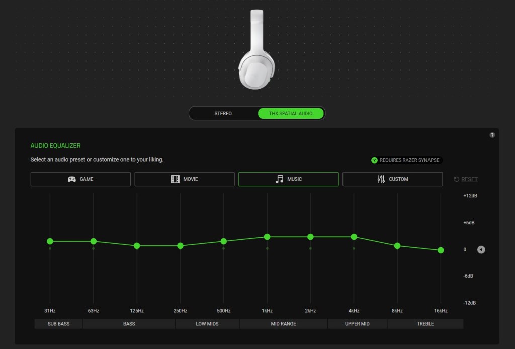 Kalau pakai di komputer, bisa atur EQ di Synapse, aplikasi dari Razer. Di sana juga bisa atur mode stereo atau THX Spatial Audio. Nah, pas gue tanya ke Google AI, THX Spatial Audio lebih enak dipake buat main game. Untuk denger lagu, better stereo aja. Soalnya mode THX Spatial Audio tuh jadi ‘manipulasi’ lagu.